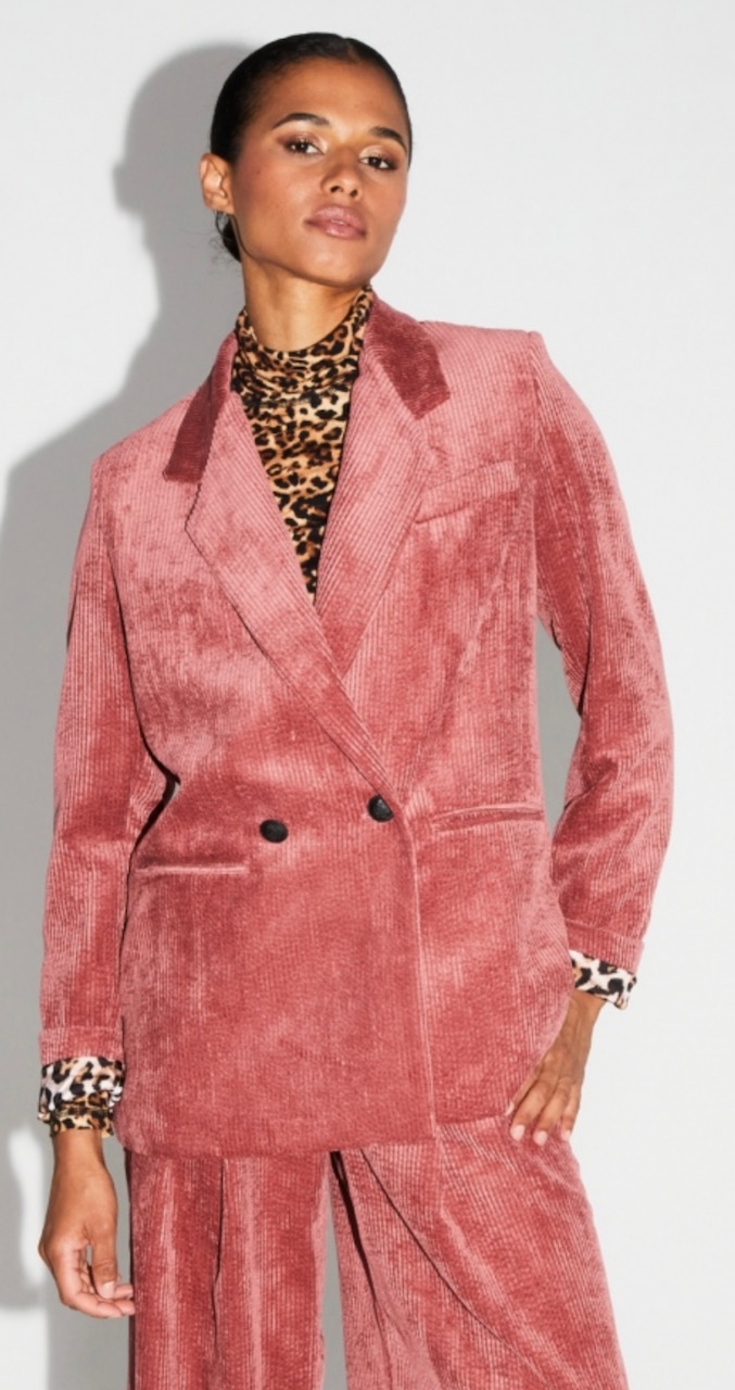 On adore le blazer EMA de notre créatrice Belge IMPREVU , de part son coté velours vintage, avec sa coupe droite, légèrement oversized,à l’esprit officier. Double boutonnage avec boutons noirs embossés d’un blason, finition mate. Velours à larges côtes, toucher doux, effet légèrement usé pour une allure vintage subtile. Son coloris Cognac chaud et vibrant. Son originalité: une doublure intérieure imprimée léopard, contraste audacieux, clin d’œil signature!