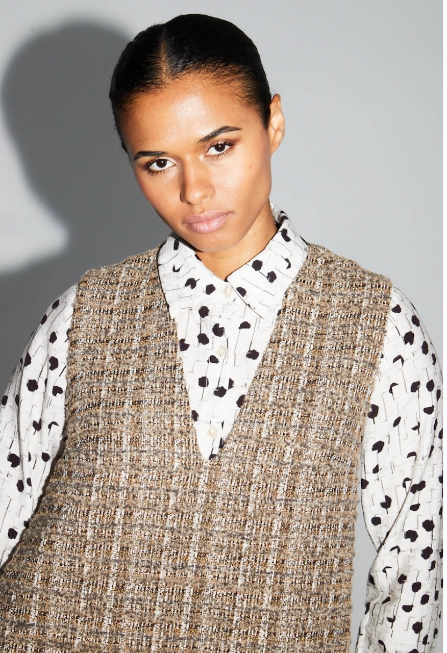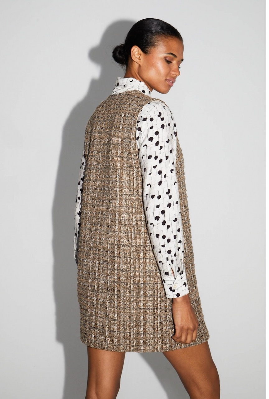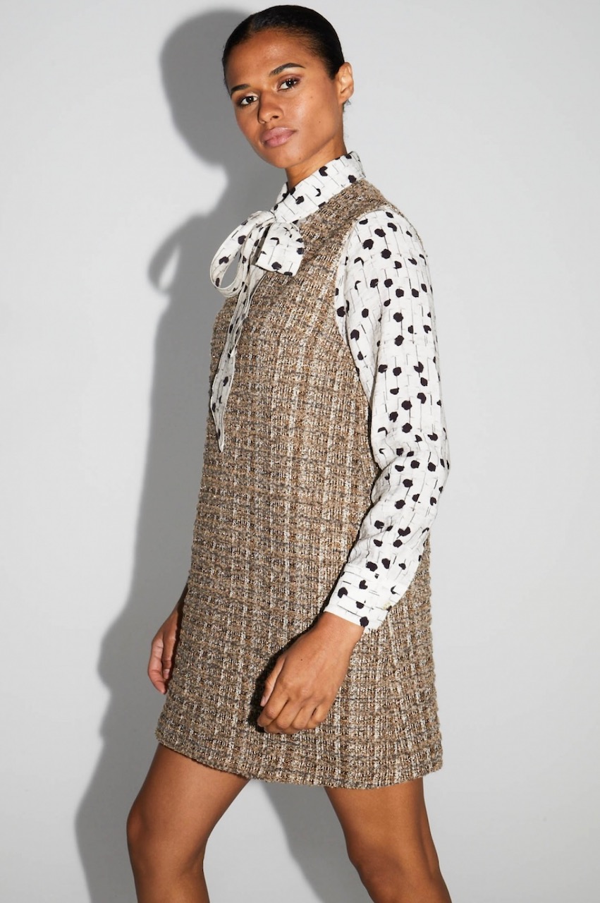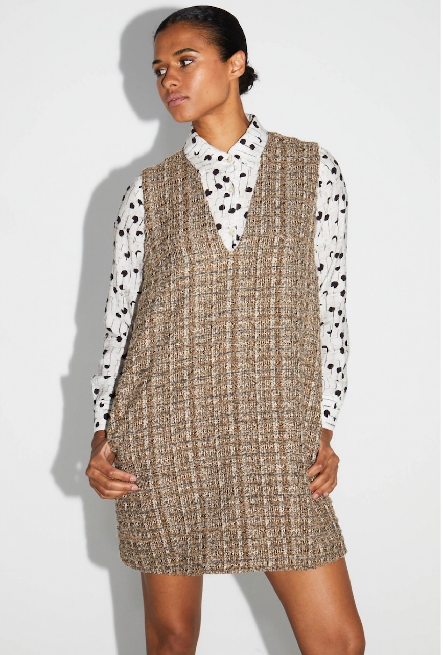 - Un tweed qui capte la lumière et donne du corps à la silhouette, sans rigidité.