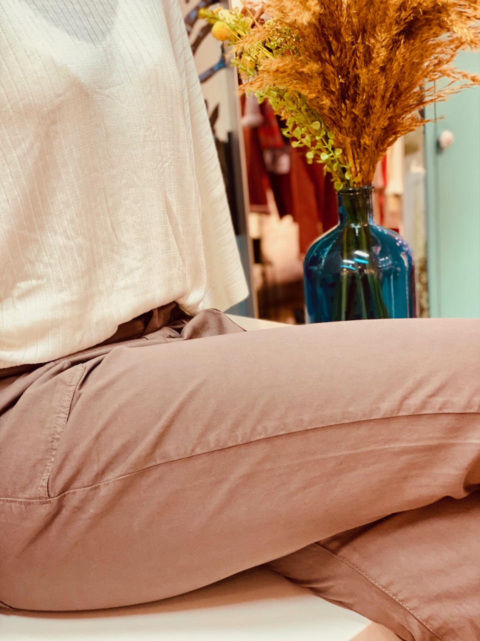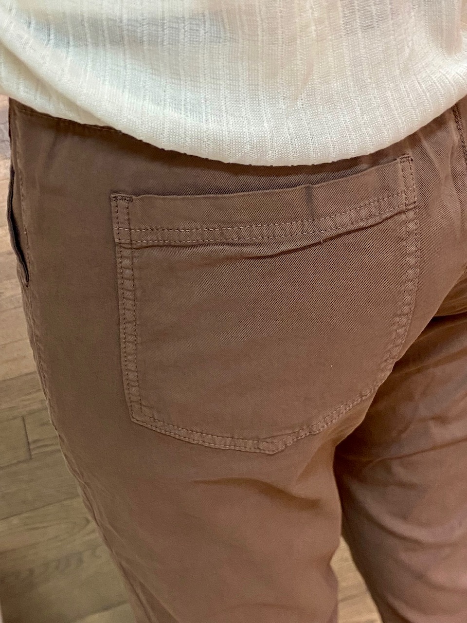 - Taille élastiquée à l’arrière, boutonnée devant, coupe droite.